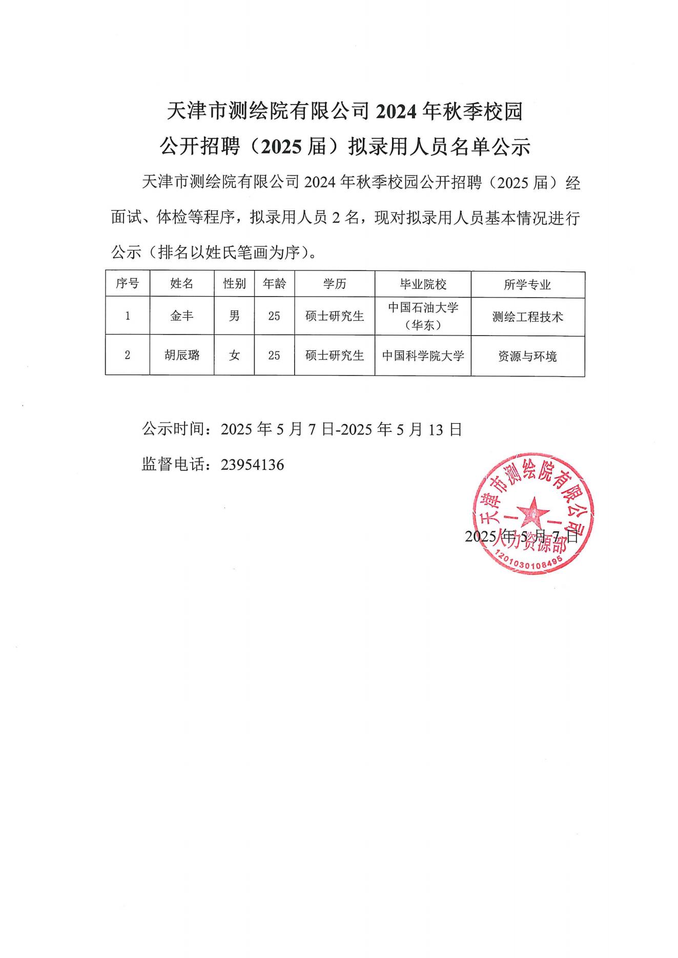 下一篇:天津市测绘院有限公司2025年春季校园公开招聘(2025届)拟录用人员名单公示
